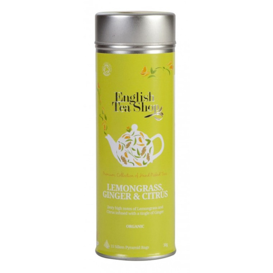 English Tea Shop Bio Citronová tráva, Zázvor a Citrusy 15 kusů bioodbouratelných pyramidek čaje v recyklovatelné plechové dóze 30 g