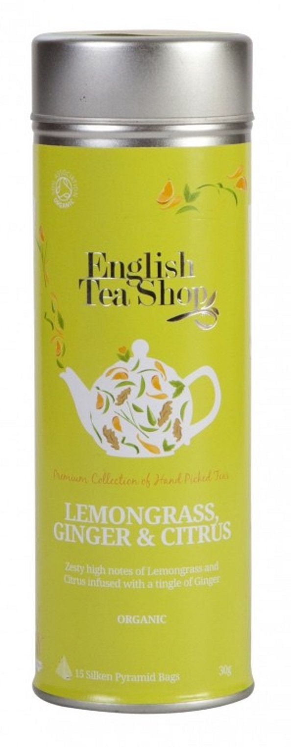 English Tea Shop Bio Citronová tráva, Zázvor a Citrusy 15 kusů bioodbouratelných pyramidek čaje v recyklovatelné plechové dóze 30 g