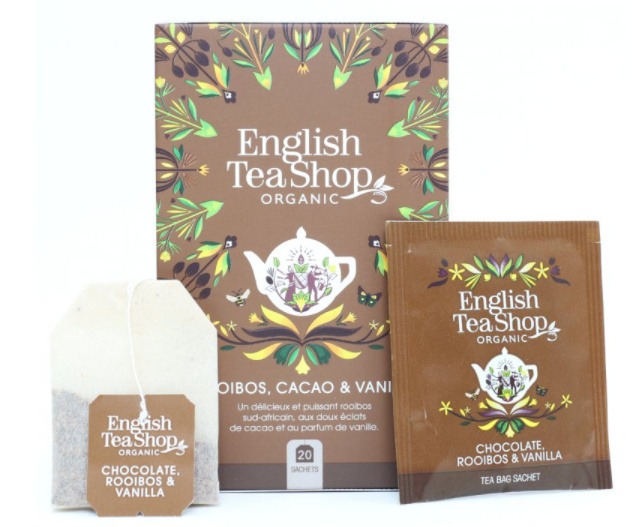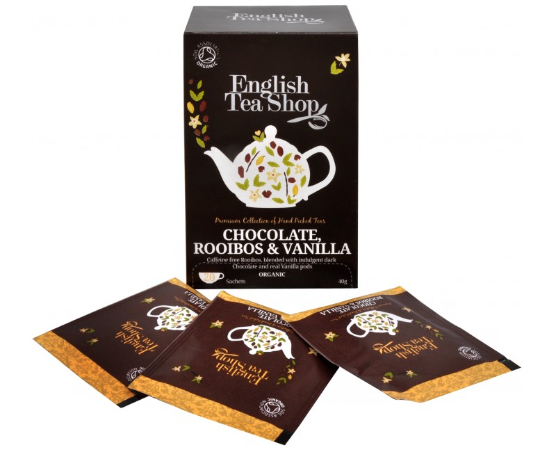 Čaj Rooibos, Čokoláda a vanilka v bio kvalitě v pyramidce od značky English Tea Shop vás překvapí sladce Karamelovou chutí, která je přirozeně bez teinu. Díky tomu je ideální pro těhotné a kojící ženy a děti. English Tea Shop nabízí čistě přírodní čaje bez syntetických příchutí a barviv. English Tea Shop nese CERTIFIKÁTY bio, Fairtrade a veškerý obalový materiál i samotné čajové sáčky jsou biologicky odbouratelné a recyklovatelné. Jejich výroba je zcela bezuhlíková.