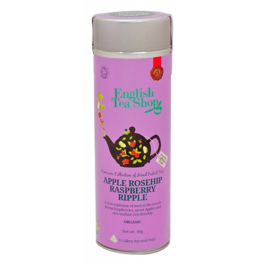 English Tea Shop Bio Šípek a Malina 15 kusů bioodbouratelných pyramidek čaje v recyklovatelné plechové dóze 30 g