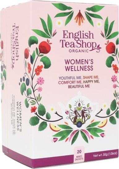 Dámský wellness - balení obsahuje mix 5 příchutí čajů, 20 nálevových sáčků. English Tea Shop nabízí čistě přírodní čaje bez syntetických příchutí a barviv. English Tea Shop nese CERTIFIKÁTY bio, Fairtrade a veškerý obalový materiál i samotné čajové sáčky jsou biologicky odbouratelné a recyklovatelné. Jejich výroba je zcela bezuhlíková.