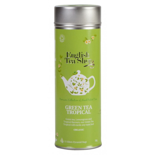 English Tea Shop Bio Zelený čaj s Tropickým ovocm 15 kusů bioodbouratelných pyramidek čaje v recyklovatelné plechové dóze 30 g