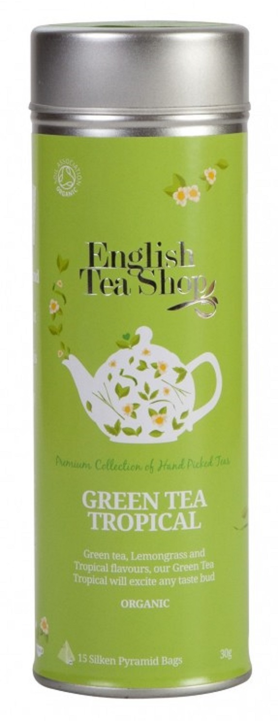 English Tea Shop Bio Zelený čaj s Tropickým ovocm 15 kusů bioodbouratelných pyramidek čaje v recyklovatelné plechové dóze 30 g
