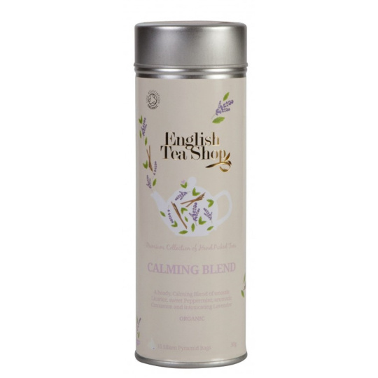 English Tea Shop Bio Zklidňující směs 15 kusů bioodbouratelných pyramidek čaje v recyklovatelné plechové dóze 30 g