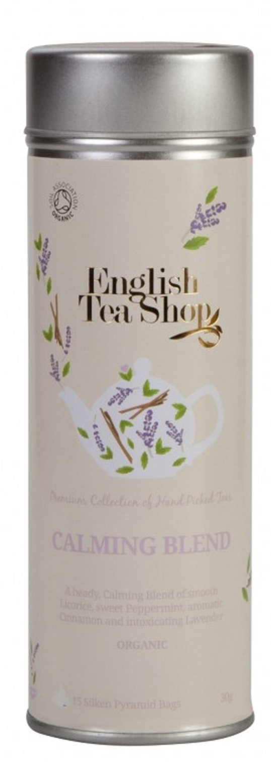 English Tea Shop Bio Zklidňující směs 15 kusů bioodbouratelných pyramidek čaje v recyklovatelné plechové dóze 30 g