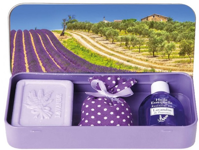 Esprit Provence Levandule toaletní mýdlo 60 g + vonný pytlík + esenciální olej 12 ml + plechová krabička, kosmetická sada pro ženy