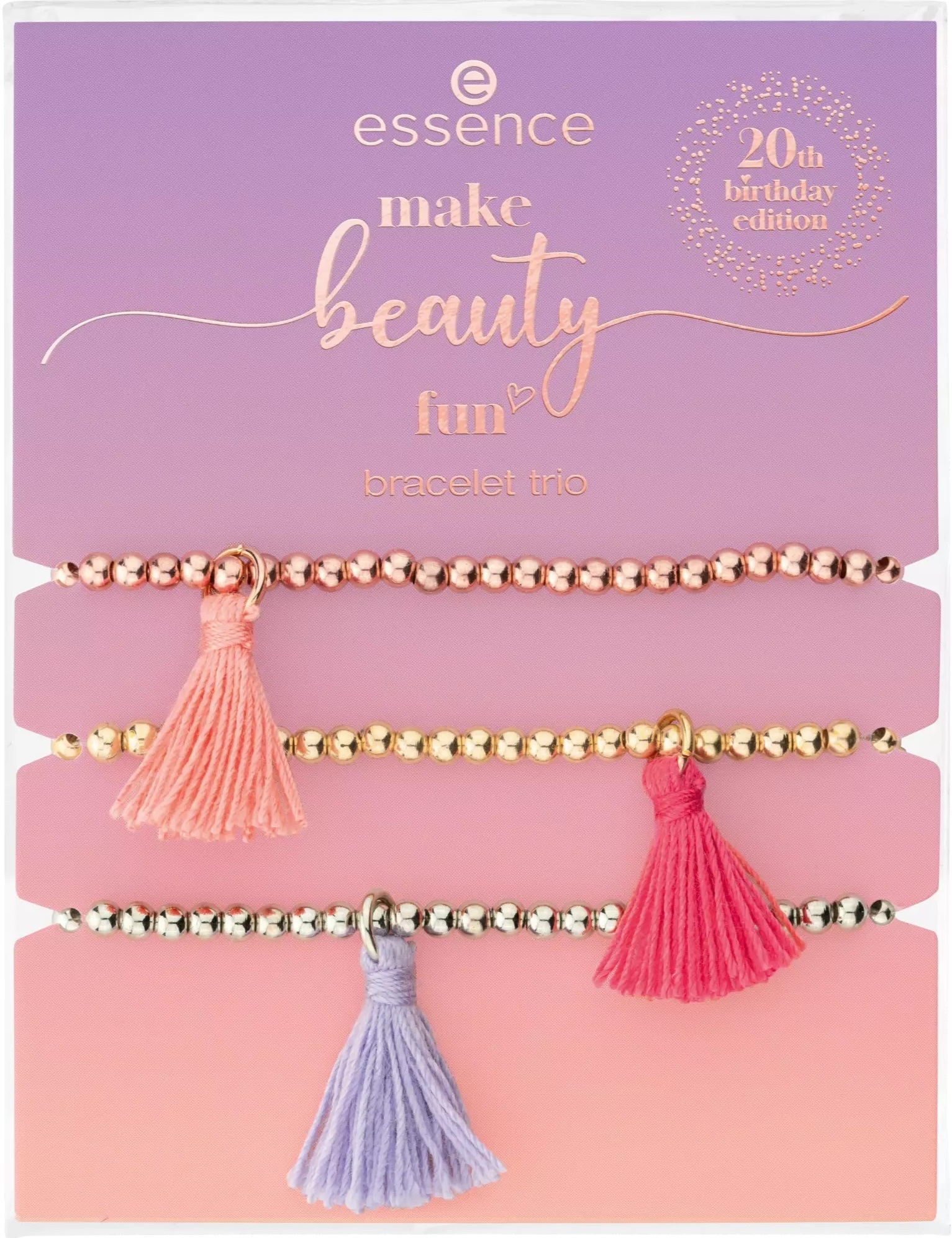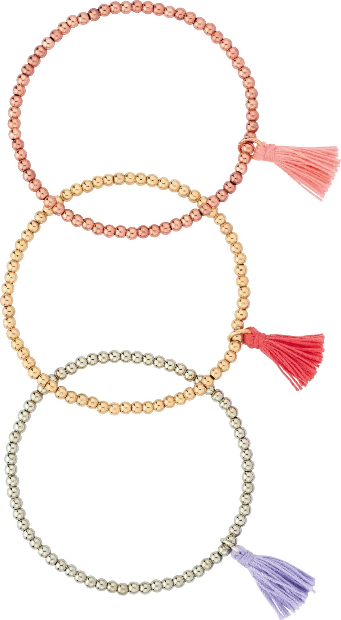 Trio náramků je ideální pro sdílení s vašimi BFF nebo jako dárek. Sada se skládá ze tří korálkových náramků - Stříbrného, zlatého a růžovo-zlatého s malými třásněmi. Třpytivé metalické korálkové náramky elegantně doplní váš look.