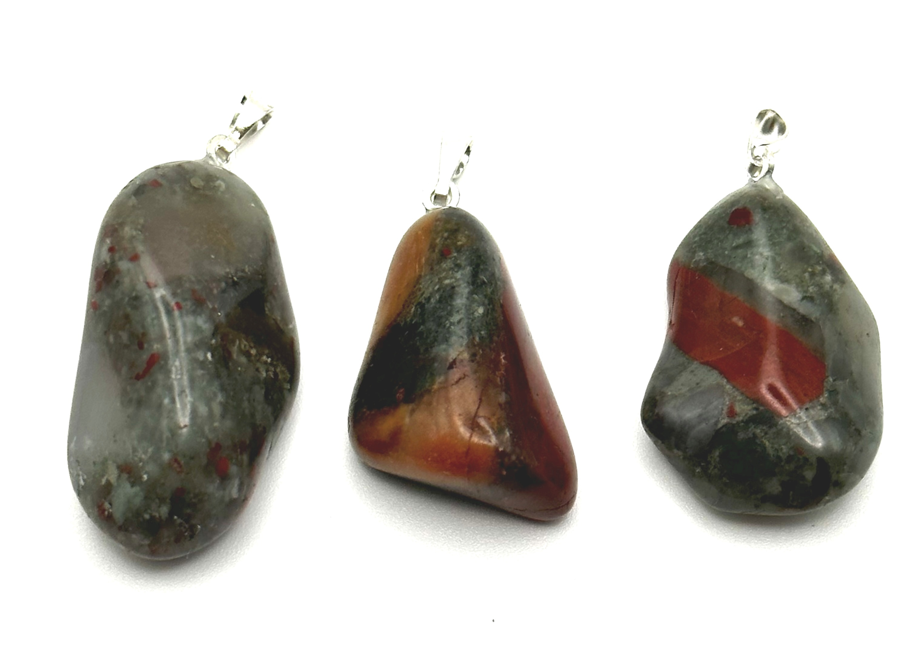 Šedozelený základ, který krásně doplňují červené zóny vyvolané drobnými úlomky Jaspisu. Některé heliotropy pak ještě obsahují i zrna pyritu. Surovina pochází z pohoří Barbeton v Jihoafrické republice.