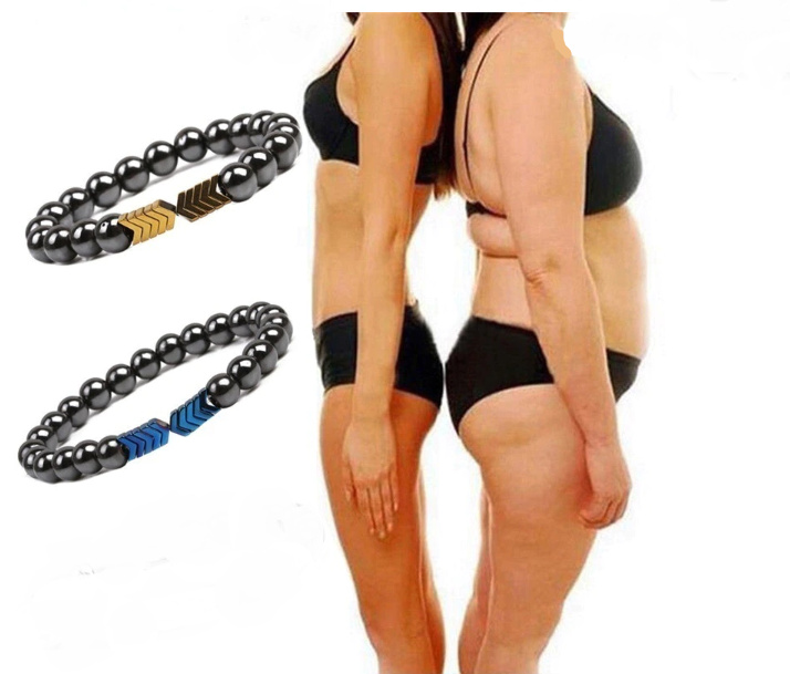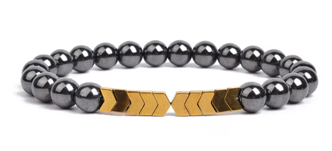 Magnetovec zeštíhlující náramek zlatá barva elastický přírodní kámen, kulička 8 mm / 21 cm