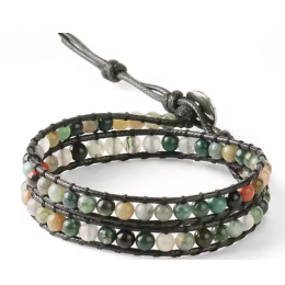 Indiai achát bőr karkötő természetes kővel, kézzel készített, kapcsos, 4 mm-es gyöngy, 17 - 23 cm, bátorságot és erőt ad