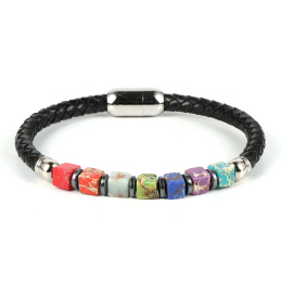 Čakrový náramek přírodní kámen kostka, pravá černá kůže 20 cm s úchytem ve stříbrné barvě