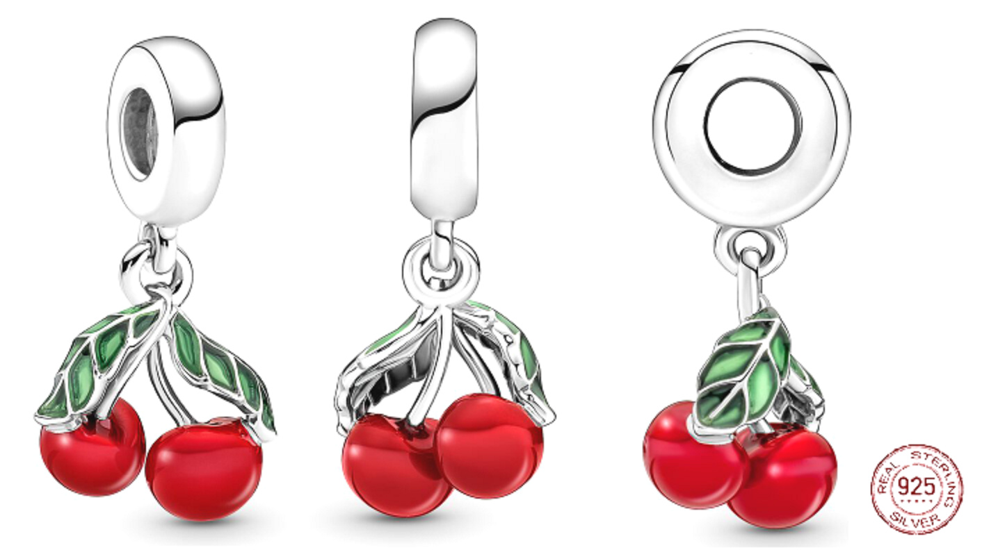 Charm Sterlingové stříbro 925 Asymetrické třešně, přívěsek na náramek, jídlo a pití