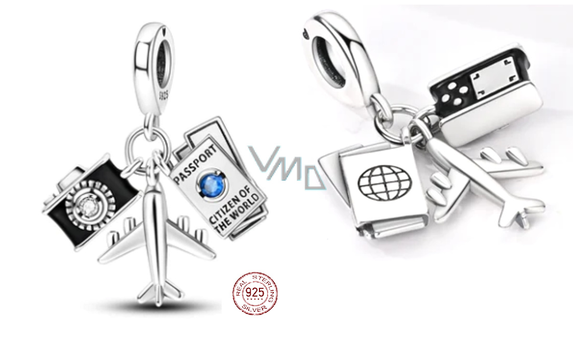 Charm Sterlingové stříbro 925 Cestovní pas, letadlo, fotoaparát 3v1, přívěsek na náramek cestování