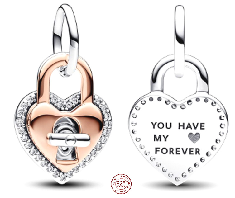 Charm Sterlingové stříbro 925 Dvoubarevné otočné srdce Visací zámek 2v1, přívěsek na náramek láska