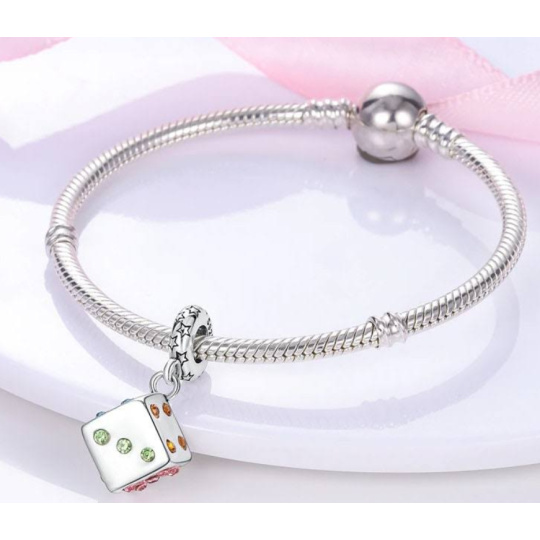 Stylový přívěsek ve tvaru Hrací kostky ze sterlingového stříbra 925, doplněn barevnými kamínky, je nejen krásným doplňkem, ale i silným symbolem odvahy, svobody volby a rozhodnutí. Jemné a detailní zpracování dodává šperku elegantní vzhled, který vynikne na každém náramku nebo řetízku. Je kompatibilní s většinou náramků známých značek.