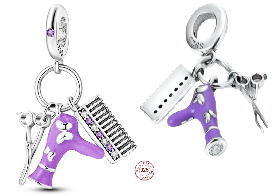 Visací přívěsek 925 Sterling Silver obsahující kadeřnickou sadu skládající se z nůžek, hřebenu a fénu. Dekorováno hladkým fialovým smaltem a zářivými bílými a fialovými drahokamy Zirkonu. Vyprávějte svůj příběh s každým přívěskem a vytvořte náramek, který odráží, kdo jste. Tvůj styl. Váš náramek. Tvůj příběh.