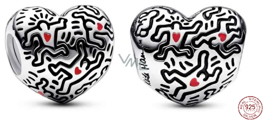 Charm Sterlingové stříbro 925 Keith Haring srdce Umění linek a lidé, korálek na náramek symbol