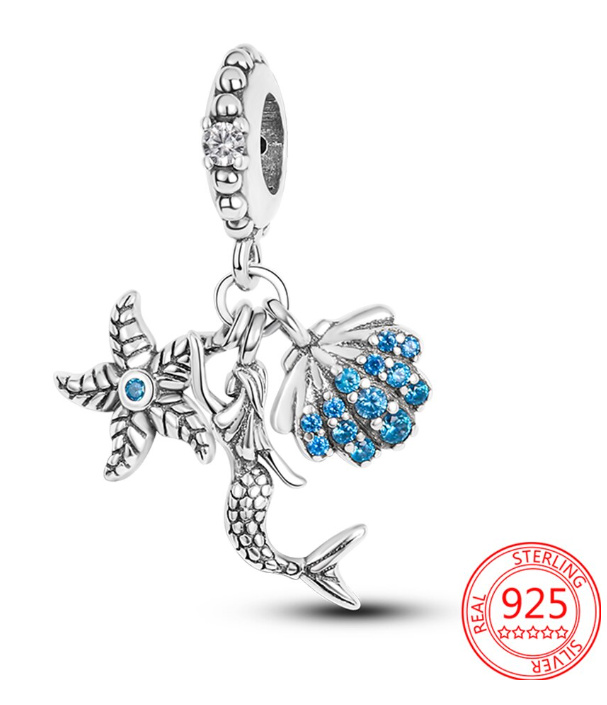 Charm Sterlingové stříbro 925 Mořská panna, hvězdice, škeble, 3v1 přívěsek na náramek, moře