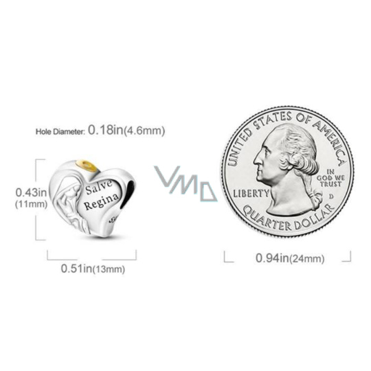 925 Sterlingové stříbro přívěsek ve tvaru srdce s Pannou Marií s pozlacenou svatozáří a na něm vyrytá slova „Salve Regina“, známá také jako „Hail Holy Queen“ - Zdrávas Svatá Královno. S každým přívěskem vyprávějte svůj příběh a vytvořte náramek, který odráží, kdo jste a co je pro vás důležité. Tvůj styl. Váš náramek. Tvůj příběh.