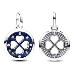 Tento moderní amulet vyzařuje lásku a štěstí se čtyřmi výřezy ve tvaru čtyřlístku obklopeného třpytivým tmavě modrým smaltem, čirými kameny a vyvýšenými hvězdami. Zadní stranu zdobí rýhované linie a mikro kuličky.