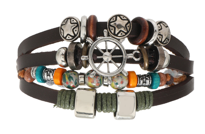 Kožený vícevrstvý náramek, symbol kormidlo + hvězda, nastavitelná velikost