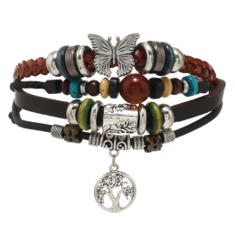 Kožený vícevrstvý náramek, symbol Strom života + motýl, nastavitelná velikost