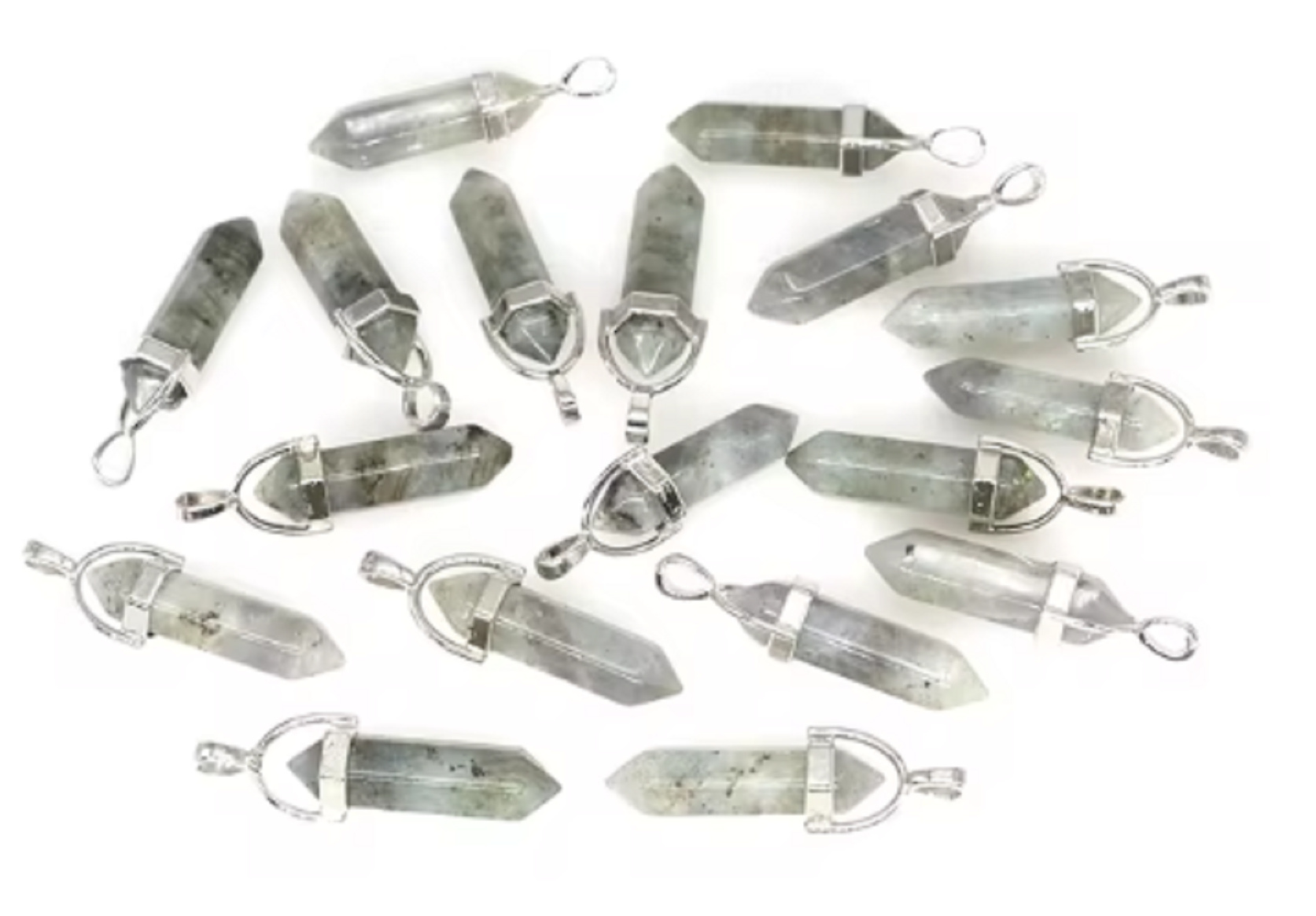 Labradorit světlý Kyvadlo šestihran přívěsek přírodní kámen 41 x 13 mm, ručně vyřezávaný, kámen proměny