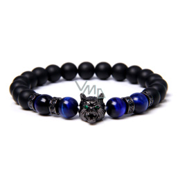 Láva černá + Tygří oko tmavě modré + Vlčí hlava náramek elastický přírodní kámen, kulička 8 mm / 21 cm