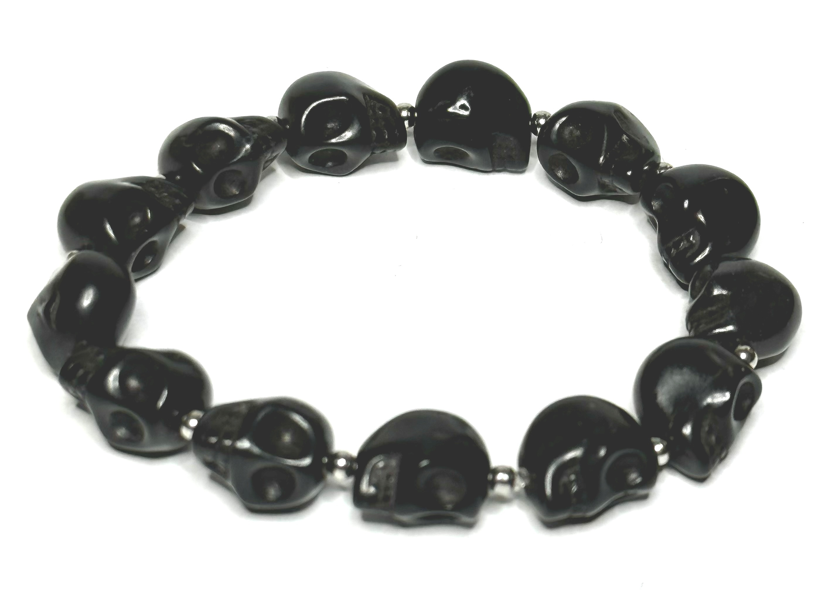 Magnezit / Howlit černý Lebka ručně vyřezaná, náramek elastický přírodní kámen 10 mm / 16 - 17 cm, očistný kámen