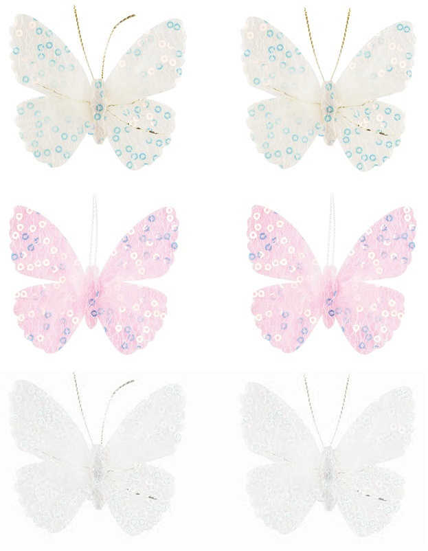 Flitteres és tollas pillangó ragasztóval, 6 cm, különböző színekben