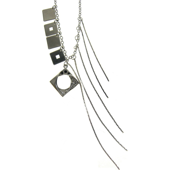 Náhrdelník s třásněmi a přívěšky ve tvaru čtverce. Bižuterní kov má stříbrnou barvu. Zapínání na klasickou karabinku.