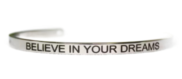 Nerezová ocel náramek stříbrný s gravírováním Věř ve své sny, otevřená manžeta, 4 mm