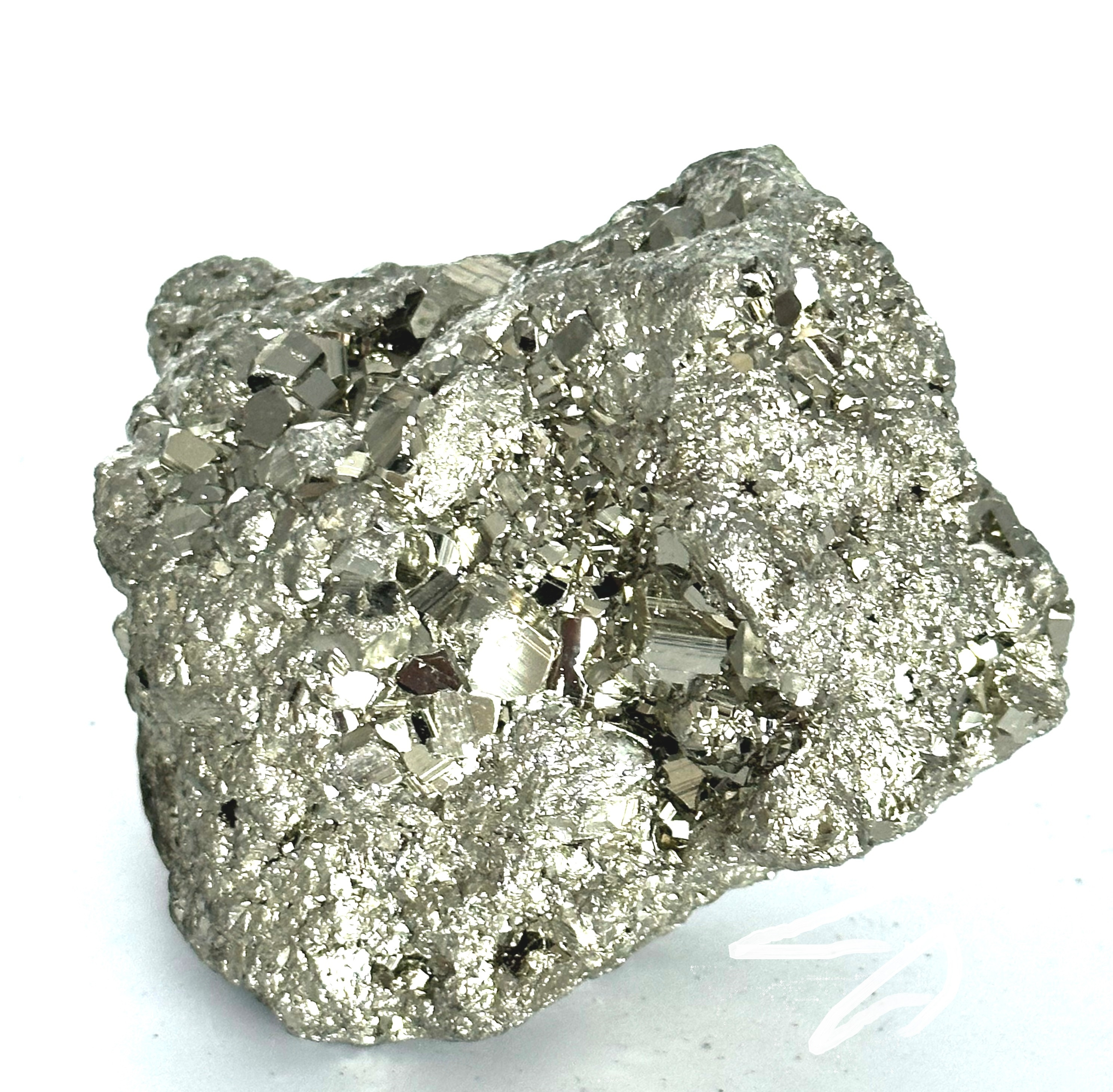Velmi estetický minerál s pravidelnými krychlovými krystaly, které mohou dorůst až do několika decimetrů. Pyrit je mezi sběrateli oblíbený pro svůj mosazně žlutý nádech a vysoký kovový lesk. Někdy se mu říká "bláznovo zlato" protože byl v minulosti často zaměňován za tento drahý kov. Lokality jeho výskytu se dají nalézt po celém světě, ale ty nejkrásnější jsou se nacházejí v Peru - stejný původ mají i naše kameny. Z hlediska chemického složení se jedná o disulfid Železa.