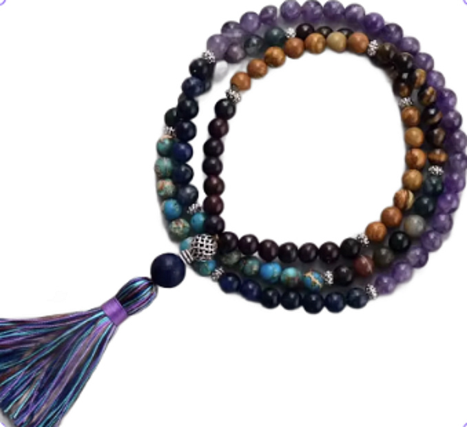 „Existují šperky… a pak jsou ty, které vás vnitřně ukotví.“ Tato Japa Mala je navržena jako osobní nástroj rovnováhy – propojuje sílu přírodních kamenů s hlubokou tradicí meditace. Ametyst přináší zklidnění, čistotu mysli a schopnost odstupu. Jaspis dodává stabilitu, uzemnění a vnitřní jistotu. Tmavé minerály (obsidián/onyx) působí jako ochranný prvek, který pomáhá držet hranice a nepouštět k sobě negativní vlivy. Modré kameny podporují klid, soustředění a hlubší vnímání. Výsledkem je harmonie mezi klidem a silou – přesně to, co potřebujete v každodenním životě.
