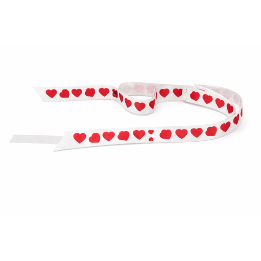 Dekorativní bílá stuha s červenými srdíčky je určená jako rozložená varianta ke stahovací kokardě. Slouží k detailnímu zobrazení vzoru, délky a kvality materiálu a zároveň nabízí možnost samostatného kreativního použití při balení dárků.