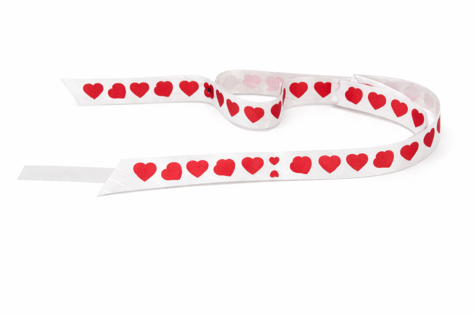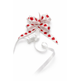 Dekorativní bílá stuha s červenými srdíčky je určená jako rozložená varianta ke stahovací kokardě. Slouží k detailnímu zobrazení vzoru, délky a kvality materiálu a zároveň nabízí možnost samostatného kreativního použití při balení dárků.