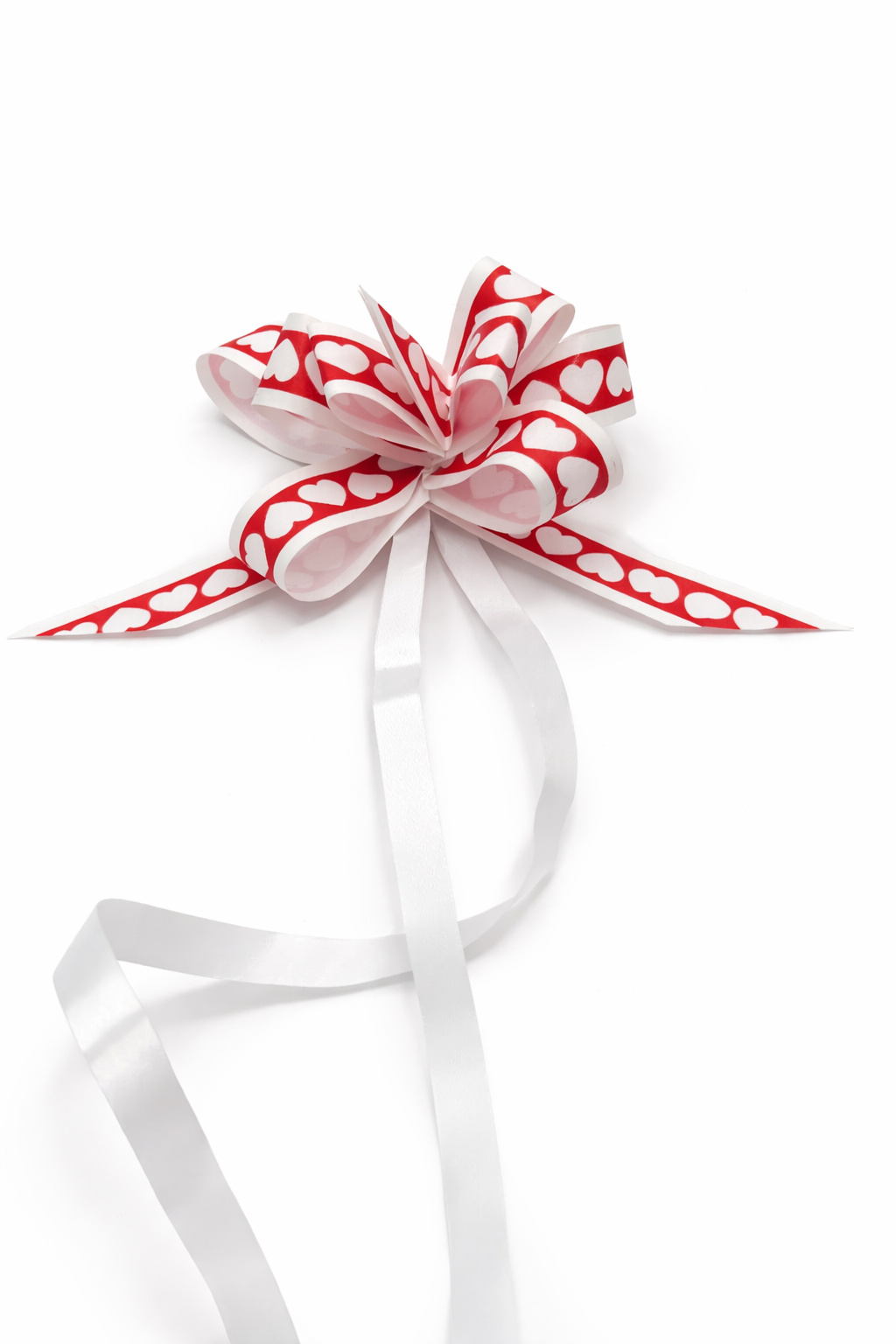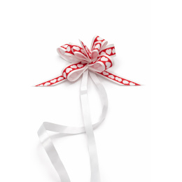 Dekorativní stuha v bílé barvě s červenými srdíčky je určená ke stahovací kokardě a slouží jako její rozložená varianta před stažením. Umožňuje detailně vidět vzor, délku i kvalitu materiálu a zároveň dává možnost kreativního využití i bez vytvoření mašle.