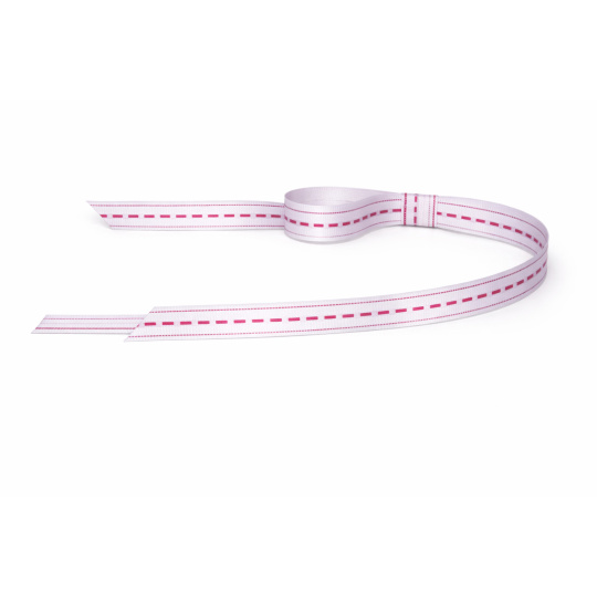 Dekorativní bílá stuha s růžovým proužkovaným vzorem je rozložená varianta ke stahovací kokardě a slouží k detailnímu zobrazení designu, struktury i délky stuhy. Jemný růžový vzor v kombinaci s čistou bílou barvou působí elegantně, romanticky a velmi jemně.