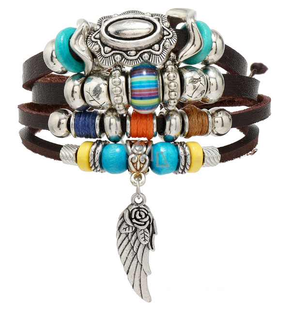 Kožený vícevrstvý náramek, symbol andělské křídlo nastavitelná velikost