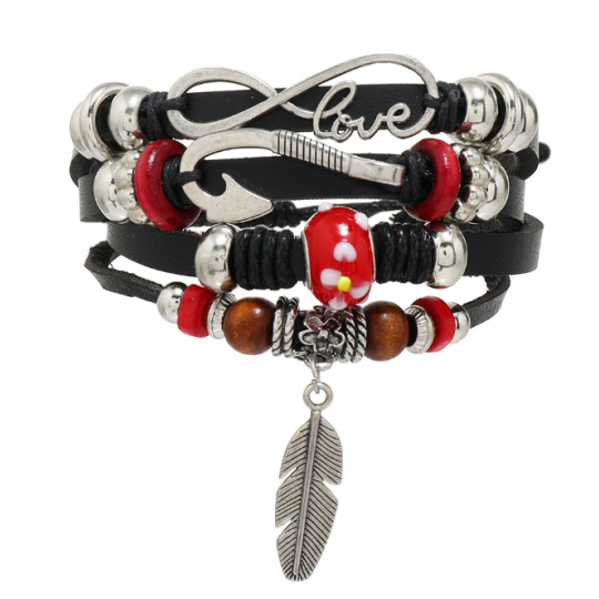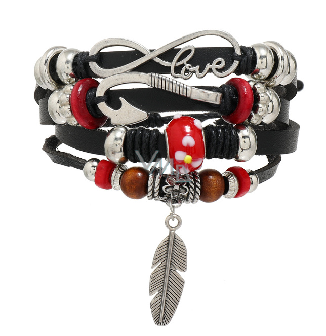 Kožený vícevrstvý náramek, symbol peříčko + kotva + nekonečno, nastavitelná velikost