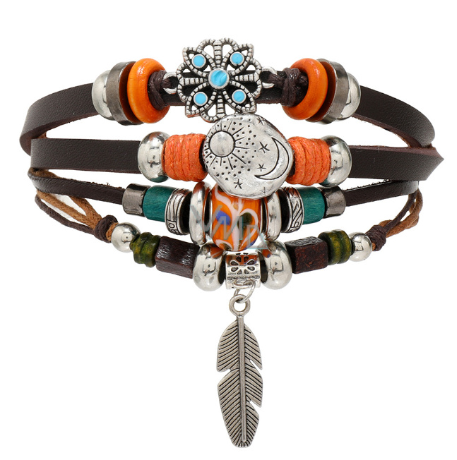 Kožený vícevrstvý náramek, symbol peříčko + měsíc / slunce, nastavitelná velikost