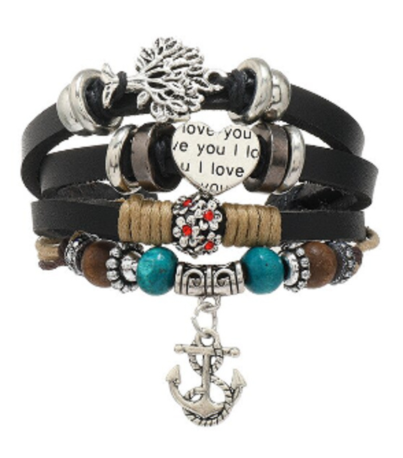 Kožený vícevrstvý náramek, symbol Strom života + kotva, nastavitelná velikost