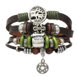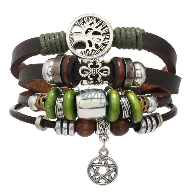 Kožený vícevrstvý náramek, symbol Strom života + lilie + Davidova hvězda, nastavitelná velikost