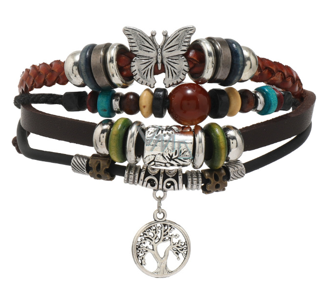 Kožený vícevrstvý náramek, symbol Strom života + motýl, nastavitelná velikost
