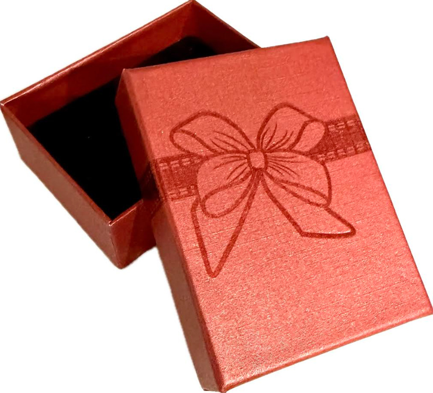 Stylová dárková krabička na šperky v elegantní červené barvě s reliéfním potiskem mašle je dokonalým doplňkem pro darování prstenů, přívěsků, náramků či náušnic. Černá houbičková vložka uvnitř poskytuje šperkům bezpečné uložení a zároveň krásně zvýrazní jejich lesk.