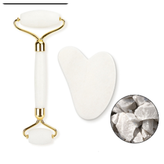 Křemen Gua Sha 5 x 8 cm + váleček masážní 14 x 5,5 cm redukuje vrásky, otoky, zlepšuje pružnost pokožky, sada