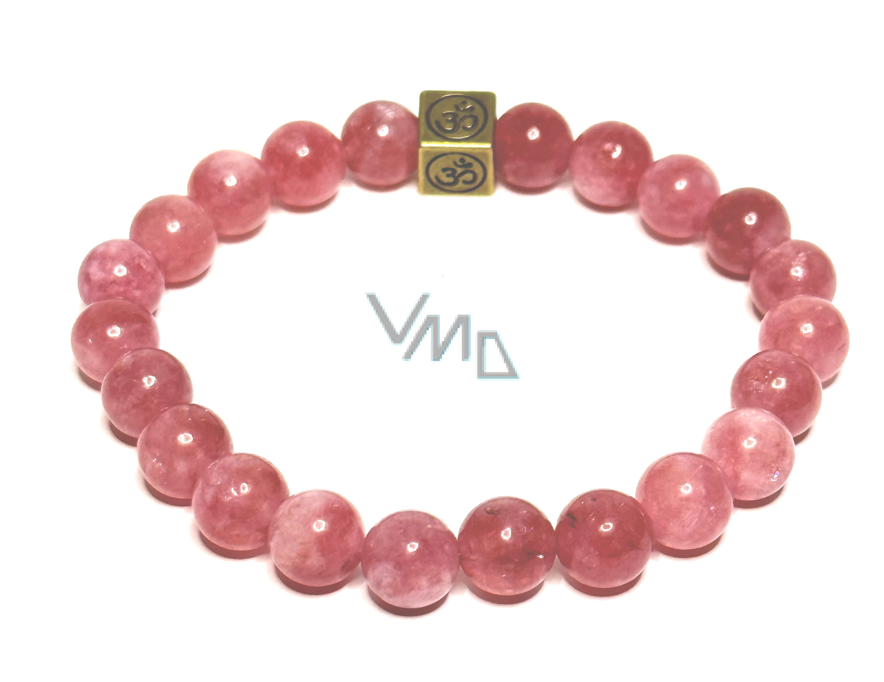 Křemen růžový / jahodový s královskou mantrou Óm náramek elastický přírodní kámen, kulička 8 mm / 16 - 17 cm, AAA kvalita, nejdokonalejší léčitel