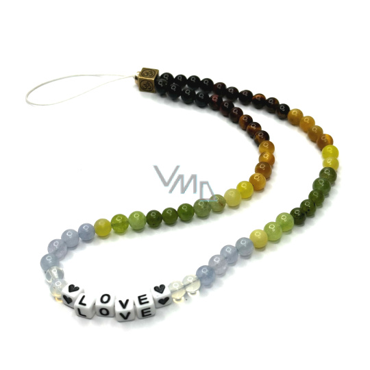 - Přívěsek na telefon disponuje korálky z přírodního kamene na šňůrce, kterou lze upevnit ke krytu telefonu