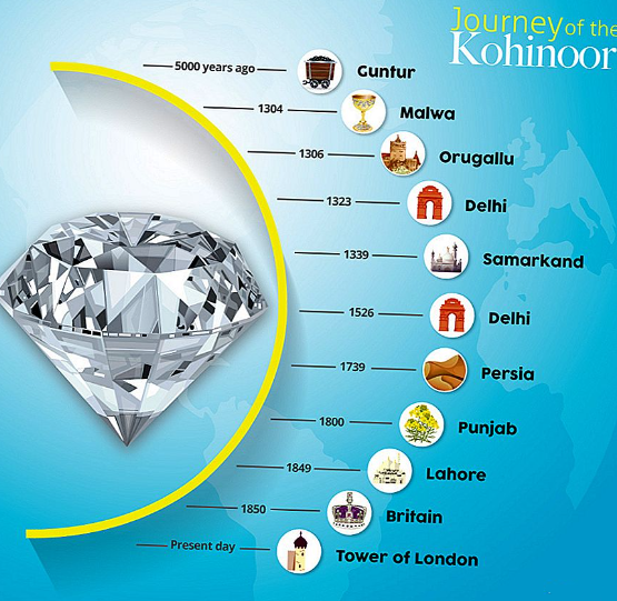 - Diamant "Kohinoor", nebo spíše „Koh-i-Nur“, což znamená „hora světla“, byl hlavním pokladem vládnoucí dynastie Mughalů v Indii. Nepřinášel štěstí téměř nikomu, téměř všichni jeho majitelé se stali oběťmi zrady nebo intrik. Kdysi vážil téměř 800 karátů, nyní je to něco přes 120. Od roku 1850, kdy byl kámen předán královně Viktorii, zdobí britskou korunu, nyní jej nosí Elizabeth II.