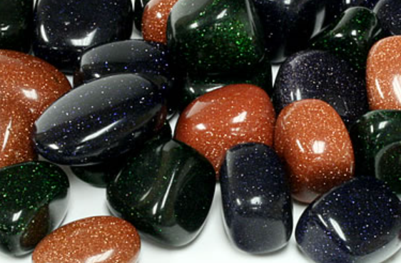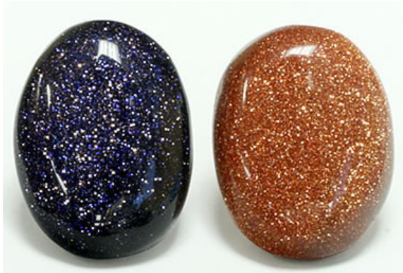 • Blue Goldstone – Místo mědi je ve směsi použit kobalt. Sklo je zbarveno do modra a třpytivý efekt zajišťují výše uvedené minerály.